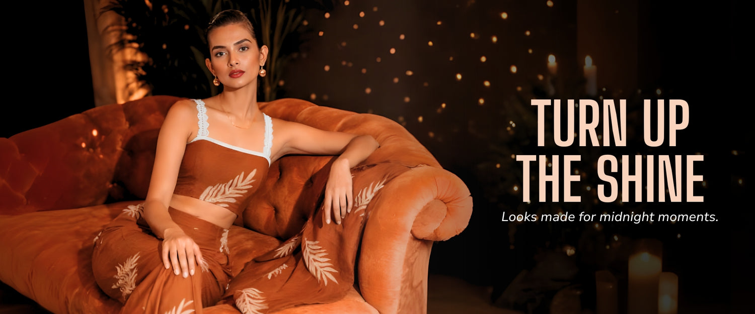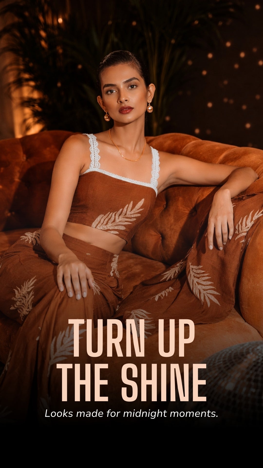 Brown Satin Minimal Print Top – Statement Neckline Party Wear