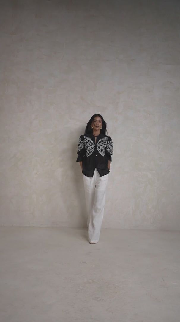 Black Shirt Top with White Premium Embroidery – Elegant & Chic