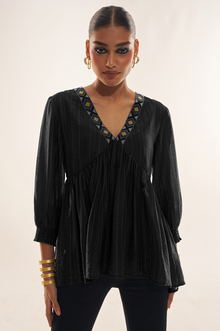 Turn heads with the Midnight Allure Top, designed to redefine evening elegance. Crafted for special occasions, this black V-neck top features intricate lace detailing and a dramatic long-back silhouette that flows with confidence and grace.
