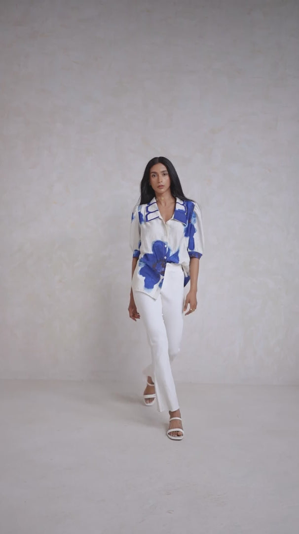Blue & Cream Printed Linen Shirt Top with Embroidery – Stylish Summer Brunch & Day Wear