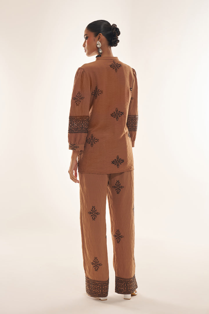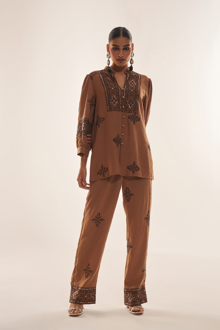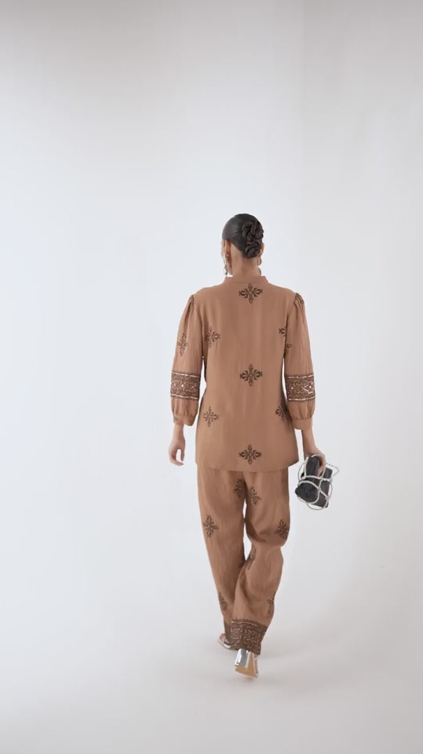 Brown Party Fusion Wear Linen Co-ord Set with Intricate Embroidery & Sequin Work