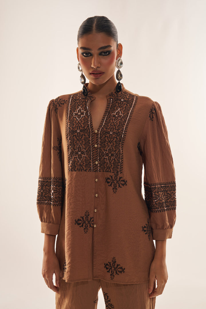 Elevate your party look with this stylish SHECZZAR brown linen co-ord set. Featuring intricate embroidery and shimmering sequin work, this fusion wear ensemble blends elegance with modern charm. Perfect for festive occasions and celebrations, it offers both comfort and sophistication in one stunning outfit.