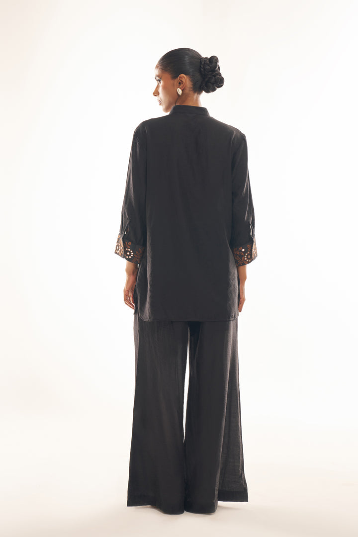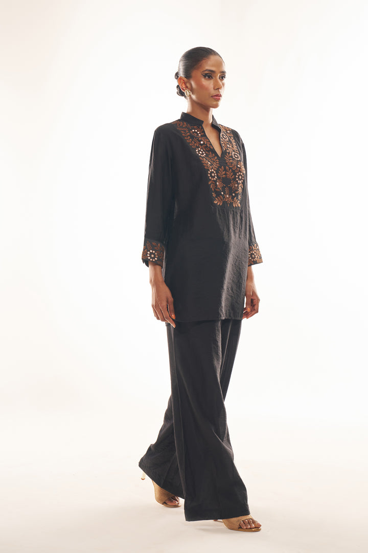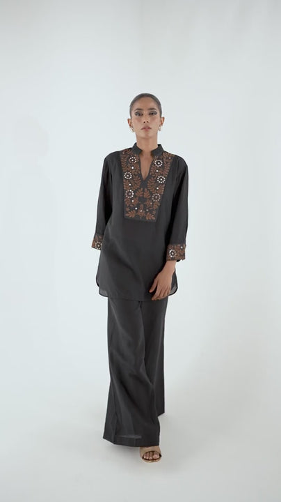 Dark Grey-Black Party Fusion Co-Ord Set with Intricate Embroidery & Mirror Work