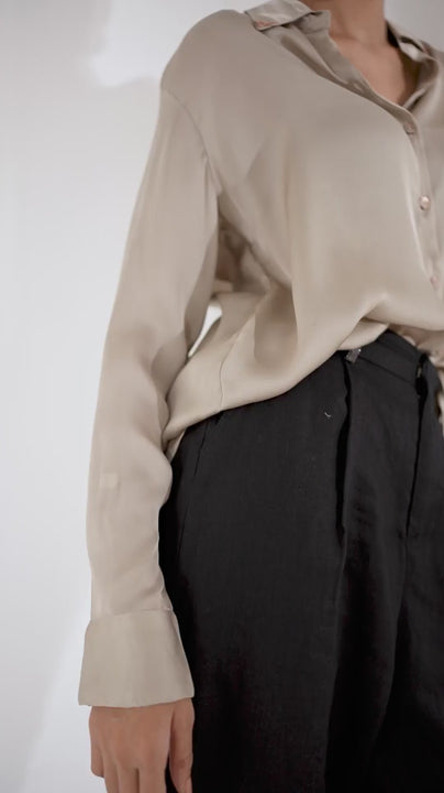 Elevate your evening look with this elegant beige satin party wear shirt, featuring intricate Saski work on the collar for a refined touch. Designed in a comfortable fit, it blends style and ease, making it perfect for formal events, celebrations, and sophisticated gatherings.