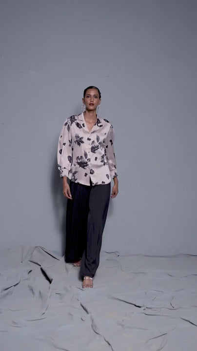 Graceful, opulent, and designed to make a statement — this Floral Satin Top with Blazer Look Neckline & Handwork Sleeves brings luxury and modern femininity together. Crafted from premium satin fabric, it offers a lustrous drape and smooth texture that feels exquisite on the skin. The blazer-style neckline adds a structured, chic appeal, while the intricate handwork on the sleeves elevates the design with a hint of artisanal charm.