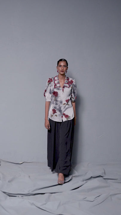 Light Grey Floral Satin Top with Embroidered Statement Collar – Premium Designer Wear