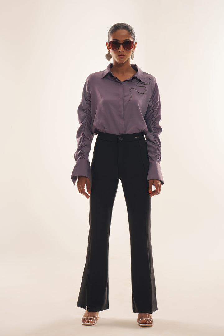 Elevate your evening look with this elegant purple formal party wear top, featuring intricate silver handwork for a touch of luxury. The stylish smocked sleeves add a chic, modern flair, making it perfect for celebrations, special occasions, and sophisticated gatherings. Pair it with your favorite bottoms for a stunning ensemble.