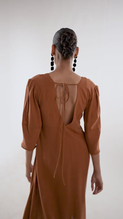 Rust Brown Long Midi Dress – Elegant Linen Fabric for Effortless Style
