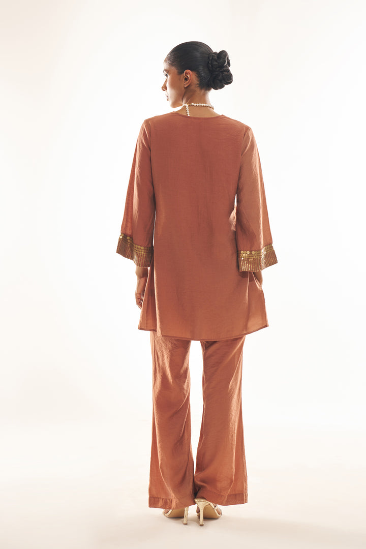Rust Orange Party Fusion Wear Co-ord Set with Intricate Handwork & Matte Finish