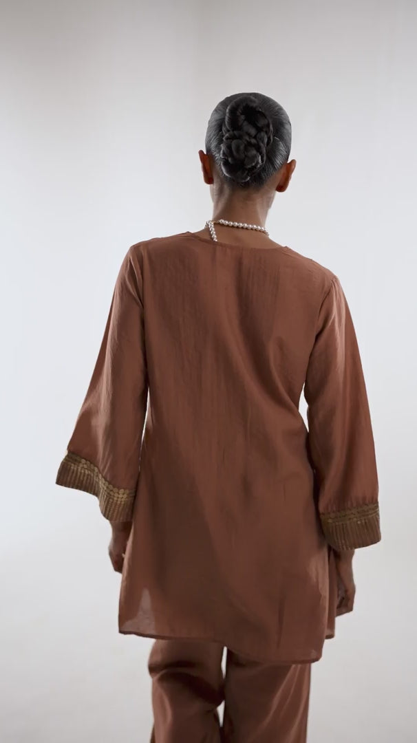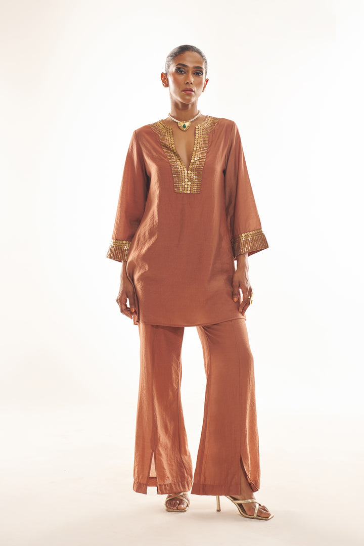 Stand out in style with this SHECZZAR rust orange co-ord set, designed for a perfect blend of elegance and modern flair. Featuring intricate handwork and a sophisticated matte finish, this fusion wear ensemble is ideal for festive gatherings and special occasions, offering a chic yet comfortable look.