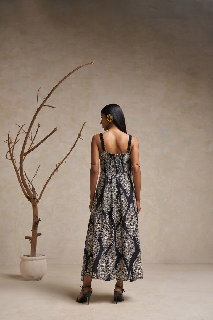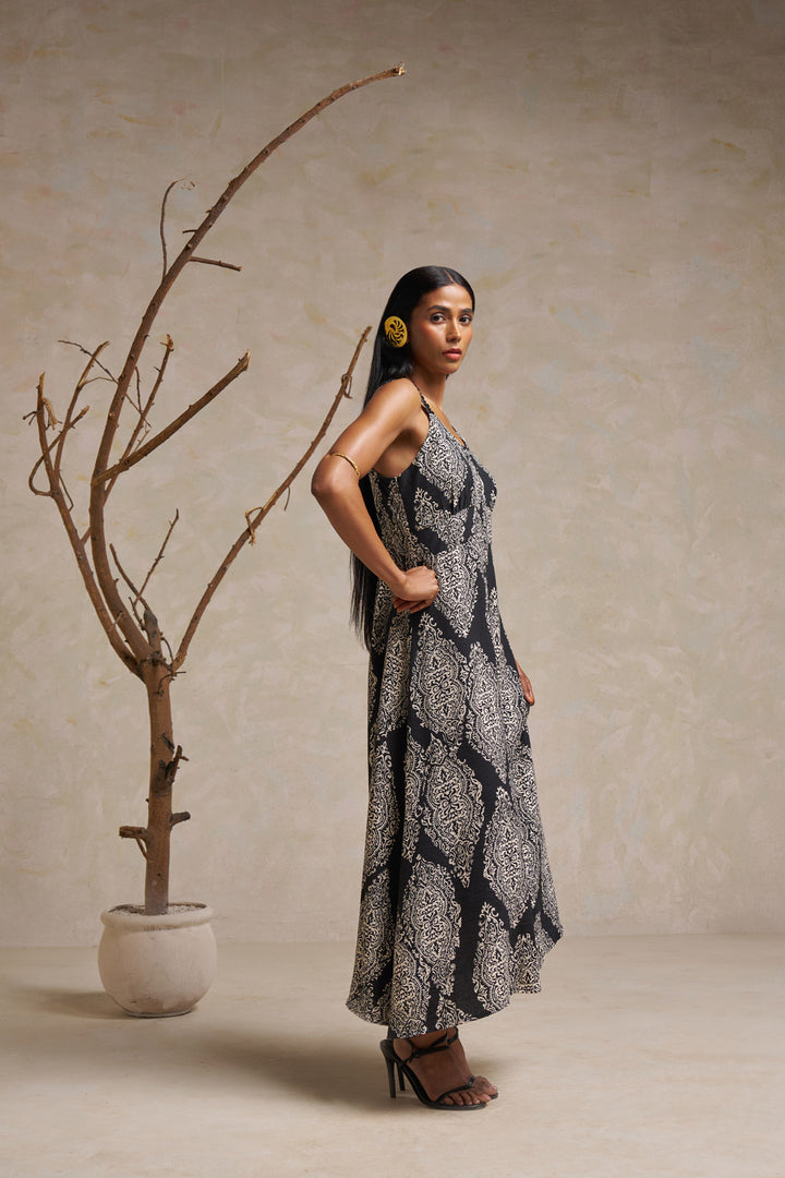 Spaghetti Strap Ankle-Length Midi Dress with Lace Work – Black & White Linen Elegance