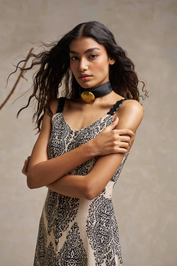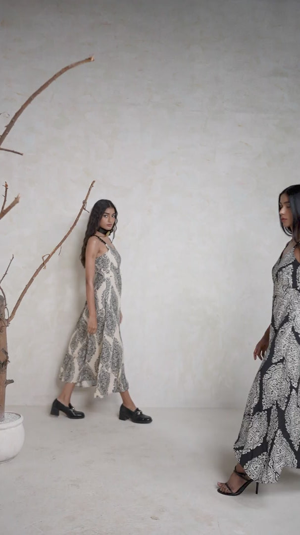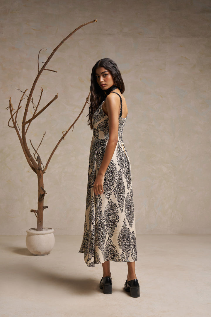 Spaghetti Strap Ankle-Length Midi Dress with Lace Work – Black & White Linen Fabric