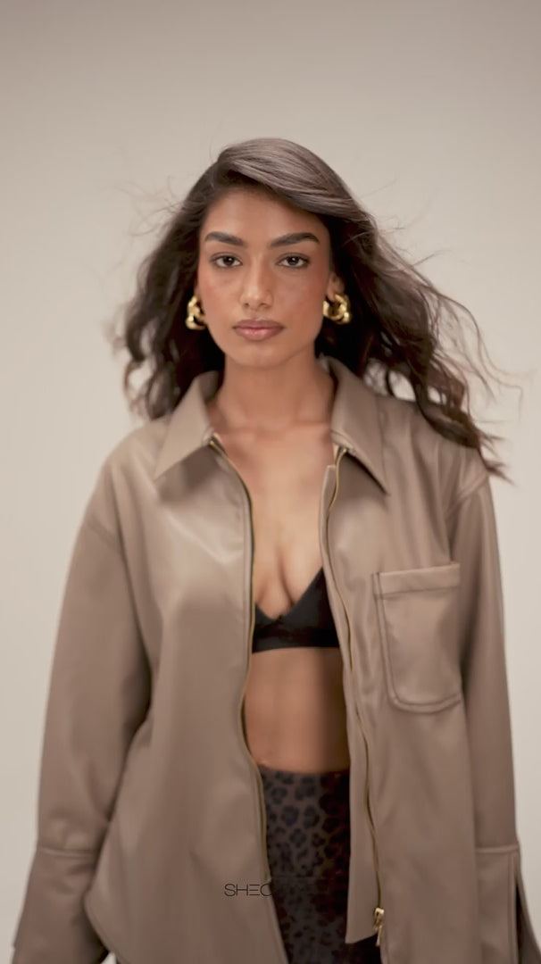 Elevate your outerwear game with SHECZZAR’s Taupe Fabric-Leather Shirt Jacket — crafted from premium faux leather that mimics the luxurious look of leather while offering lightweight comfort and breathability. With its smooth matte finish and structured tailoring, this versatile piece transitions effortlessly from day chic to evening glam.