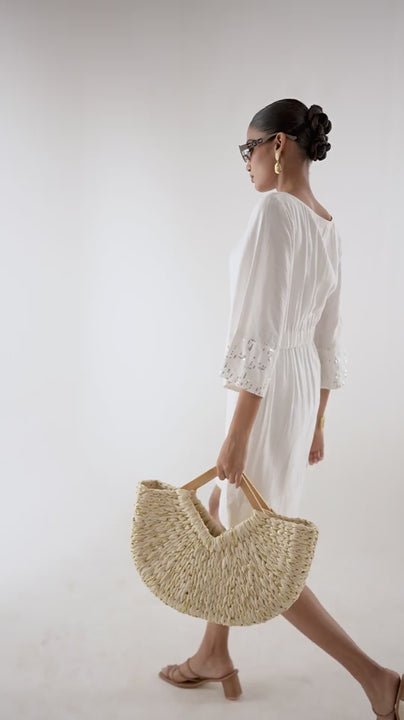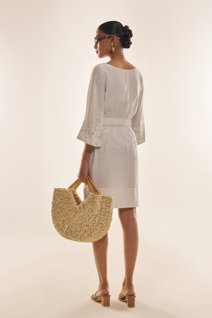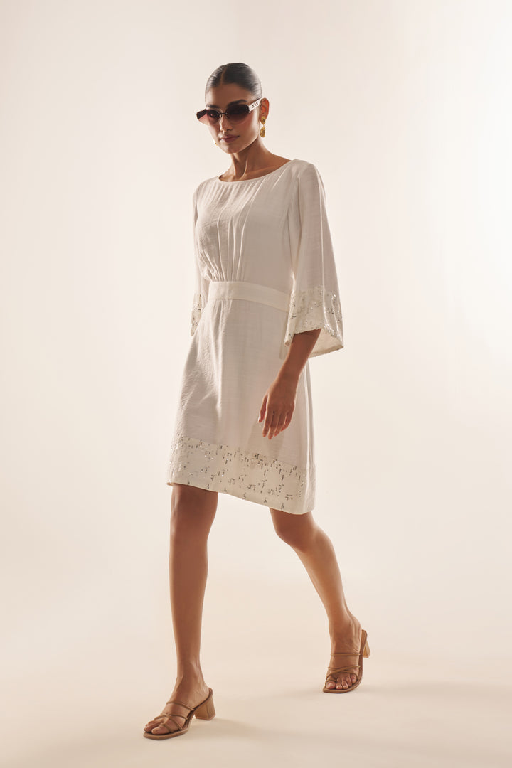 White Linen Dress with Subtle Sequin Detailing – Effortless Elegance
