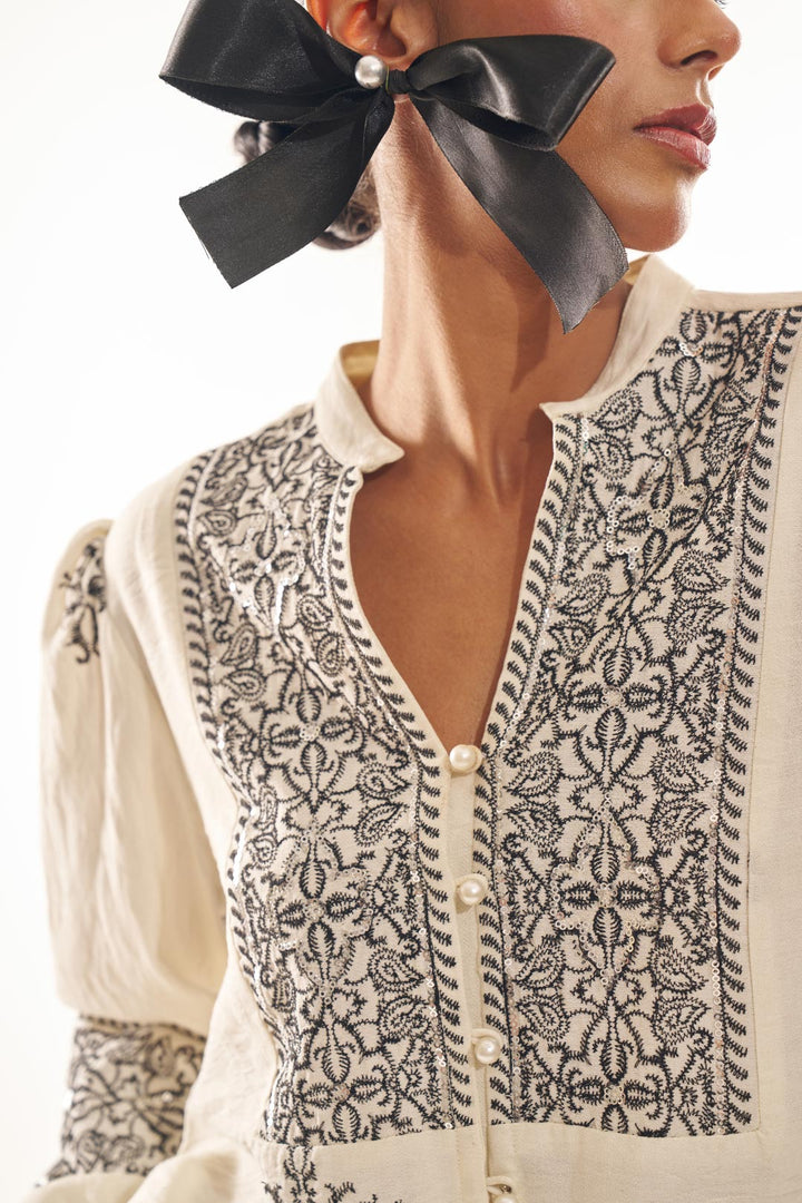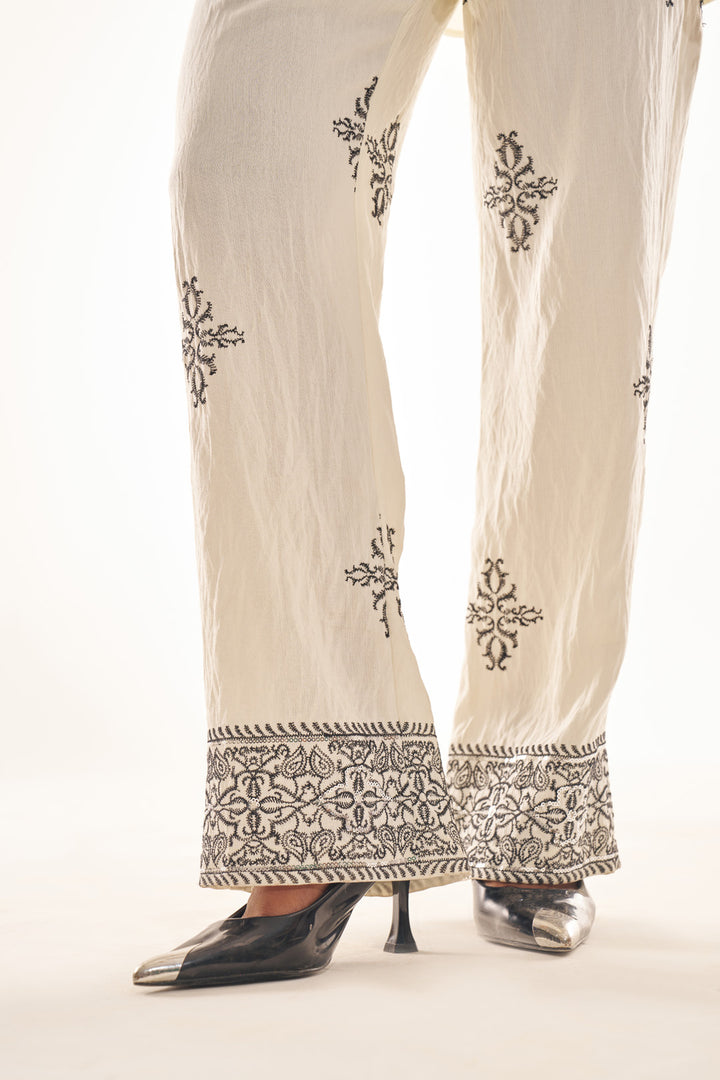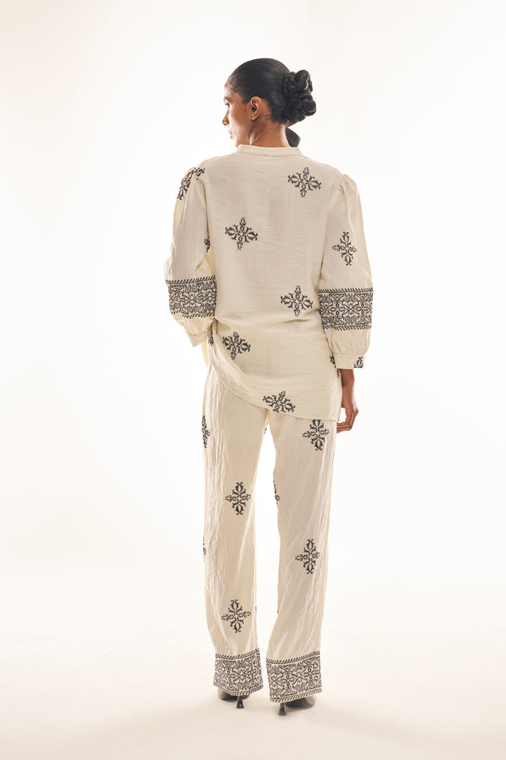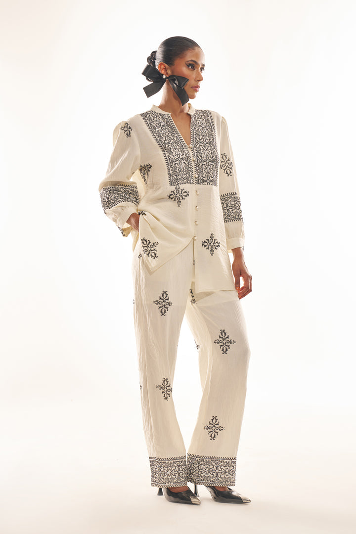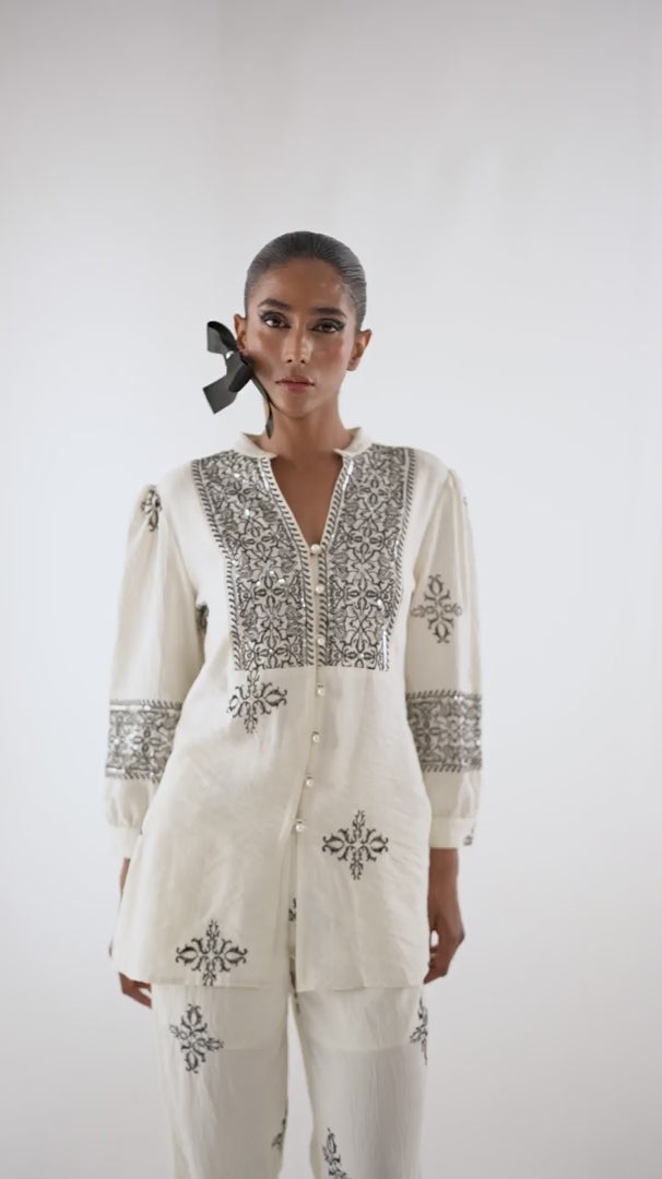 Make a statement with this elegant SHECZZAR white linen co-ord set, designed for a perfect fusion of tradition and modern style. Adorned with intricate embroidery and shimmering sequin work, this ensemble exudes sophistication, making it an ideal choice for festive gatherings and special occasions.